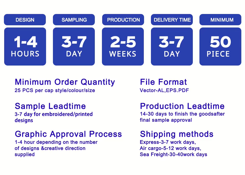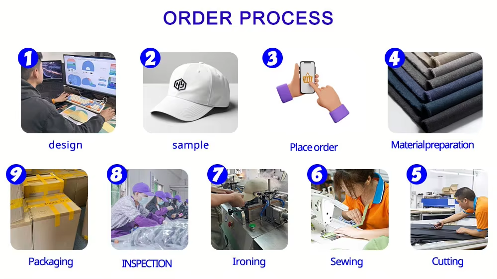 Confirm hat specifications -> confirm price -> proof -> confirm sample -> sign a contract, depositpayment and arrange bulk production - > finish production - > inspection (photo or real product) - > balancepayment->delivery->after-sales seryice.
