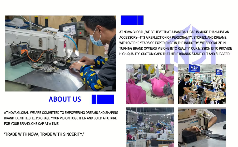Nova (Xiongan) Global Trade Co., Ltd. is a professional B2B enterprise with a team of 11-50 employees, focusing on custom hat manufacturing. Relying on China's superior supply chain resources, we provide agile production and high-quality custom hat solutions for global brands. Our products are exported to North America, Western Europe and Asia, committed to delivering tailored services and excellent quality to customers worldwide.